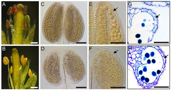 - Yang, C.; Xu, Z.; Song, J.; Conner, K.; Vizcay Barrena, G.; Wilson, Z.A. Arabidopsis MYB26/MALE STERILE35 regulates secondary thickening in the endothecium and is essential for anther dehiscence. Plant Cell 2007, 19, 534–548. [Google Scholar] [CrossRef]
