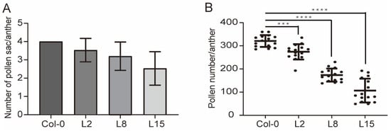The number of pollen sacs and pollen in pUBQ10:TCP5 plants: (A) number of pollen sacs from three different pUBQ10:TCP5 transgenic plants compared to the wild type, with the pollen sac number counted from fifteen anthers (cross-sections of anthers from five plants); and (B) pollen number per anther in the wild type and three different pUBQ10:TCP5 plants. ***, p ≤ 0.001; ****, p ≤ 0.0001.
