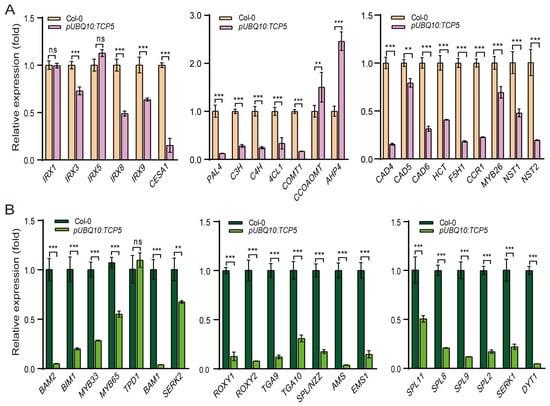 Overexpression of TCP5 affected the expression profiles of many genes involved in secondary cell wall thickening and early-anther development: (A) expression levels of genes associated with secondary cell wall thickening in pUBQ10:TCP5 plants; and (B) expression levels of genes involved in early-anther development in pUBQ10:TCP5 plants. ns, not significant; **, p ≤ 0.01; and ***, p ≤ 0.001.