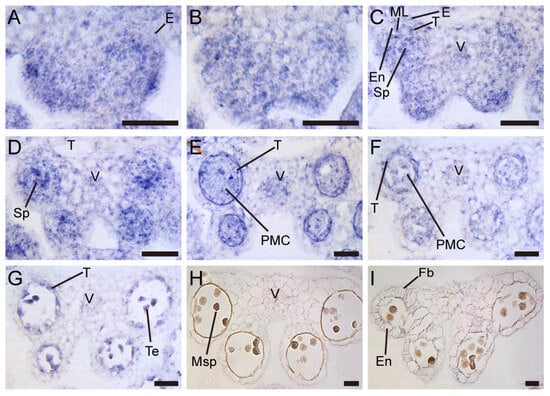Consequently, we performed RNA in situ hybridization for TCP5 in wild-type anthers. At stages 2–3, the TCP5 expression signal was evenly distributed throughout the region, with a strong signal in the corners (Figure 6A,B). Stages 4–5 saw the formation of the four lobes on the anthers. The TCP5 signal was detected in the epidermis, endothecium, middle layer, tapetum, and sporogenous cells (or pollen mother cells/PMCs), as well as vascular bundles in the connective region (Figure 6C,D). At stages 6–8, the anthers underwent meiosis, and a strong TCP5 signal appeared in the tapetum, PMCs, or tetrads, and the vascular bundles (Figure 6E–G). Following meiosis, the TCP5 signal disappeared from stage 9 to stage 13 anthers (Figure 6H,I). Thus, we concluded that TCP5 was expressed in the early anthers, contradicting the expression pattern observed in GUS plants (Figure S4C,D).
