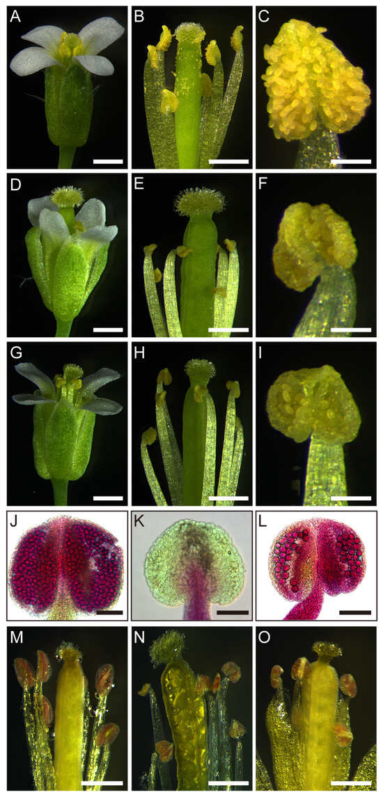 We dissected the flowers of transgenic plants with severe phenotypes using a stereomicroscope. The transgenic flowers were slightly smaller than the wild type (Figure 1D,H). The sepals and petals were morphologically normal, but the stamens, which consisted of short filaments and small anthers, surrounded a gynoecium with fewer stigmatic papillae (Figure 1E,I). Notably, these anthers did not shed pollen during the anthesis stage (Figure 1F,J). However, they produced living pollen inside, as evidenced by Alexander staining (Figure 1G,K), indicating that these anthers could not dehisce.