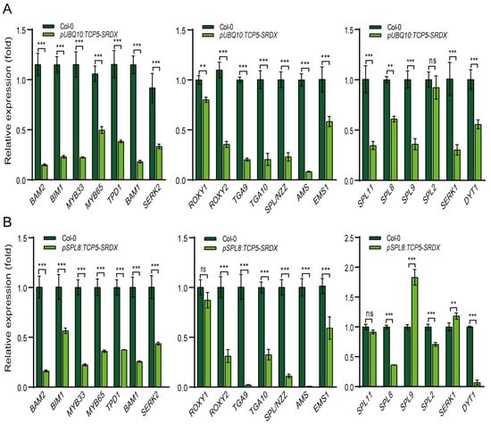 Expression profiles of early-anther genes in TCP5-SRDX transgenic plants: (A) expression changes in twenty early-anther genes in pUBQ10:TCP5-SRDX plants compared with the wild type; and (B) expression changes in the twenty early-anther genes in pSPL8:TCP5-SRDX plants compared with the wild type. ns, not significant; **, p ≤ 0.01; and ***, p ≤ 0.001.
