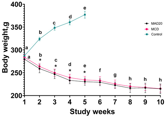 Body mass changes in male, Wistar rats over the 10-week experimental period. Data are presented as Mean ± SD. MCD—rats fed a diet free of methionine and choline, n = 8; MAD20—rats fed a modified MCD with 0.2% choline + 20% ammonium acetate, n = 8; Control—rats fed a regular rat chow diet, n = 4. Different lowercase letters indicate significant differences between body weight measurements at different time points within a single diet group. Asterisks indicate significant differences between diet groups at a given time point. p < 0.05 was considered significant.