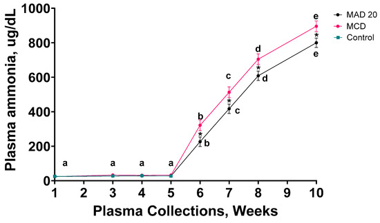 Changes in plasma ammonia levels of male, Wistar rats over the 10-week experimental period. Data are presented as Mean ± SD. MCD—rats fed a diet free of methionine and choline, n = 8; MAD20—rats fed a modified MCD with 0.2% choline + 20% ammonium acetate, n = 8; Control—rats fed a regular rat chow diet, n = 4. Different lowercase letters indicate significant differences when p < 0.05 within particular diets, while * indicates significant differences between ammonia levels of different dietary groups at a particular time point.