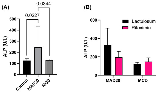 Plasma alkaline phosphatase (ALP) levels of male, Wistar rats at the end of the 10-week experimental period. (A) Plasma ALP levels of rats in the different experimental/dietary groups; (B) Plasma ALP levels of rats in the MCD and MAD20 groups after receiving either Lactulosum or Rifaximin treatment. Data are presented as Mean ± SD. MCD—rats fed a diet free of methionine and choline, n = 8; MAD20—rats fed a modified MCD with 0.2% choline + 20% ammonium acetate, n = 8; Control—rats fed a regular rat chow diet, n = 4.