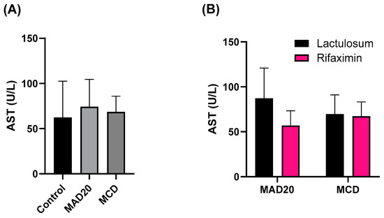 Plasma aspartate aminotransferase (AST) levels of male, Wistar rats at the end of the 10-week experimental period. (A) Plasma AST levels of rats in the different experimental/dietary groups; (B) Plasma AST levels of rats in the MCD and MAD20 groups after receiving either Lactulosum or Rifaximin treatment. Data are presented as Mean ± SD. MCD—rats fed a diet free of methionine and choline, n = 8; MAD20—rats fed a modified MCD with 0.2% choline + 20% ammonium acetate, n = 8; Control—rats fed a regular rat chow diet, n = 4.