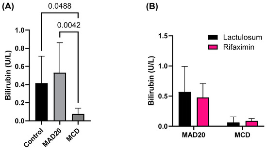 Plasma bilirubin levels of male, Wistar rats at the end of the 10-week experimental period. (A) Plasma bilirubin levels of rats in the different experimental/dietary groups; (B) Plasma bilirubin levels of rats in the MCD and MAD20 groups after receiving either Lactulosum or Rifaximin treatment. Data are presented as Mean ± SD. MCD—rats fed a diet free of methionine and choline, n = 8; MAD20—rats fed a modified MCD with 0.2% choline + 20% ammonium acetate, n = 8; Control—rats fed a regular rat chow diet, n = 4.