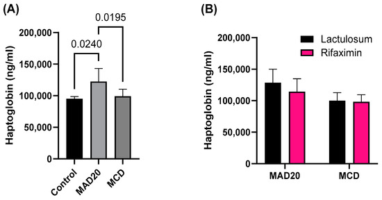 Plasma haptoglobin levels of male Wistar rats at the end of the 10-week experimental period. (A) Plasma haptoglobin levels of rats in the different experimental/dietary groups; (B) Plasma haptoglobin levels of rats in the MCD and MAD20 groups after receiving either Lactulosum or Rifaximin treatment. Data are presented as Mean ± SD. MCD—rats fed a diet free of methionine and choline, n = 8; MAD20—rats fed a modified MCD with 0.2% choline + 20% ammonium acetate, n = 8; Control—rats fed a regular rat chow diet, n = 4.