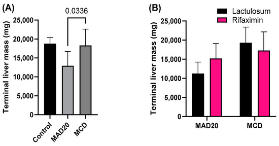 Terminal liver mass of male, Wistar rats at the end of the 10-week experimental period. (A) Terminal liver mass of rats in the different experimental/dietary groups; (B) Terminal liver mass of rats in the MCD and MAD20 groups after receiving either Lactulosum or Rifaximin treatment. Data are presented as Mean ± SD. MCD—rats fed a diet free of methionine and choline, n = 8; MAD20—rats fed a modified MCD with 0.2% choline + 20% ammonium acetate, n = 8; Control—rats fed a regular rat chow diet, n = 4.