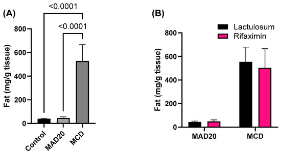 Fat content of the livers of male, Wistar rats at the end of the 10-week experimental period. (A) Fat mass of the livers of rats in the different experimental/dietary groups; (B) Fat mass of the livers of rats in the MCD and MAD20 groups after receiving either Lactulosum or Rifaximin treatment. Data are presented as Mean ± SD. MCD—rats fed a diet free of methionine and choline, n = 8; MAD20—rats fed a modified MCD with 0.2% choline + 20% ammonium acetate, n = 8; Control—rats fed a regular rat chow diet, n = 4.