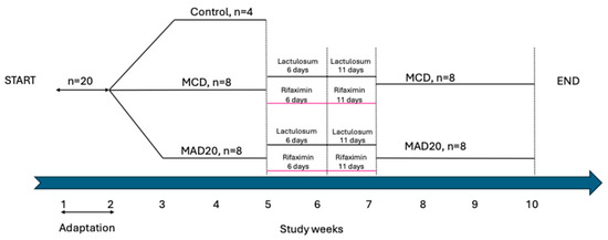 Four weeks after the start of the chronic hyperammonaemia development on the customized diets/feed formulations, two treatments to reduce serum ammonia were tested. Four rats from each of the dietary groups (MAD20 and MCD groups) received Lactulose (Lactulosum, 10 g/kg bwt/day), while the remaining four rats from each group received Rifaximin (Xifaxan, 50 mg/kg bwt/day), administered twice daily via oral gavage for six days. After that, the treatment with either Lactulosum or Rifaximin continued for another five days for two rats from each experimental group (see Figure 9 detailing experimental design). All rats that received the Lactulosum and Rifaximin treatments continued for the duration of the experiment on their respective diets.