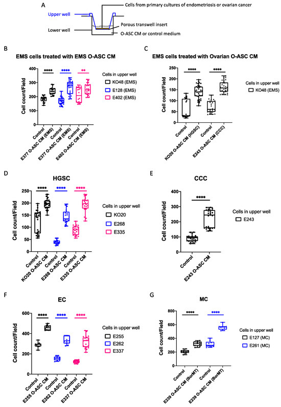 Omental-adipose stromal cell conditioned media (O-ASC CM) increased cell migratory activity in primary cultures of endometriosis and ovarian cancer using the transwell migration assay. (A) Transwell cell migration set-up using the 2-compartment Boyden chamber. (B–G) For each panel, the x-axis shows the type of medium used, the y-axis denotes the number of migrated cells, the legend indicates cells used in the upper well. (B) O-ASC CM derived from endometriosis (EMS) cases increased the migration activity of endometriosis cells. KO48 and E128 cells were assayed with O-ASC CM from E377. E402 cells was assayed with O-ASC CM from E402. (C) O-ASC CM derived from ovarian cancer cases, HGSC (KO20) and CCC (E243), increased the migration activity of endometriosis cells (KO48) more robustly than O-ASC CM derived from endometriosis patients (see (B)). (D–G) O-ASC CM derived from ovarian cancer histological subtypes increased the migration activity of ovarian cancer cells, as shown in (D): HGSC (KO20, E268, E335), (E): CCC (E243), (F): EC (E255, E262, E337) and (G): MC (E127, E261). The O-ASC CM used in each assay was derived from the same patient except in both MC cases, where the O-ASC CM was derived from a BorMT patient (E239). Unpaired t-test was used for statistical comparison (** p < 0.01; **** p < 0.0001). See also Table S2. For each experiment, five random fields were imaged per transwell and at least two replicates were included. Abbreviations: HGSC, high grade serous carcinoma; CCC, clear cell carcinoma; EC, endometrioid carcinoma; MC, mucinous carcinoma; BorMT, borderline mucinous tumor; EMS, endometriosis.