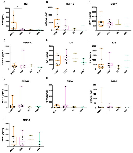 Cytokine profiles of omental-adipose stromal cell conditioned media (O-ASC CM) derived from patients with malignant ovarian tumors and benign endometriosis using Luminex assay. Quantification of (A) HGF, (B) SDF-1a, (C) MCP-1, (D) VEGF-A, (E) IL-6, (F) IL-8, (G) ENA-78, (H) GROa, (I) FGF-2 (J) MMP-1 in O-ASC CM derived from patients with high grade serous carcinoma (HGSC), n = 11; clear cell carcinoma (CCC), n = 8; endometrioid carcinoma (EC), n = 3; endometriosis (EMS), n = 3. Mann-Whitney U test was used for statistical comparison between the different histological types. (* p < 0.05). Due to small sample size, the cytokine profiles of O-ASC CM derived from patients with MC, BorMT and BeCy are not shown here, see also Table S4 and Figure S3. Abbreviations: HGSC, high grade serous carcinoma; CCC, clear cell carcinoma; EC, endometrioid carcinoma; MC, mucinous carcinoma; BorMT, borderline mucinous tumor; EMS, endometriosis.