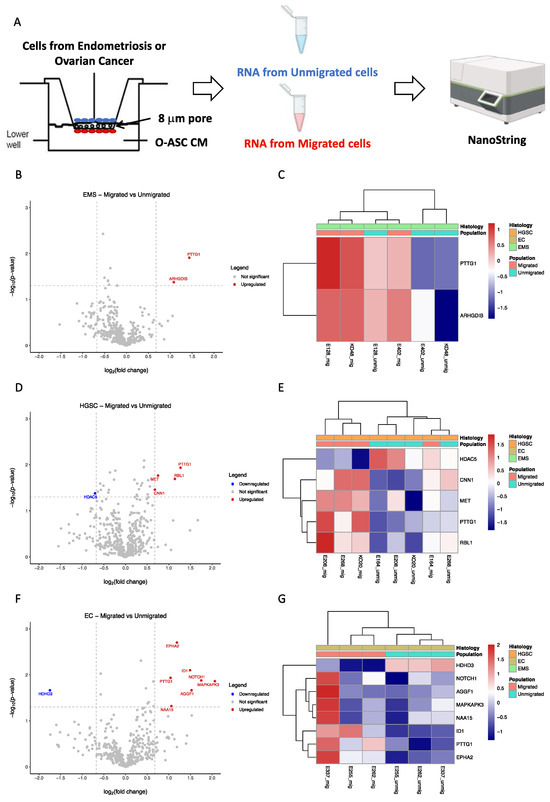 Differentially expressed genes between migrated and unmigrated cell populations of endometriosis and ovarian cancer in the presence of omental-adipose stromal cell conditioned media (O-ASC CM). (A) Schematic diagram of the experimental set-up. The O-ASC CM used in the lower well were histologically-matched with cells added in the upper well (KO20 O-ASC CM with HGSC cells, n = 4; E337 O-ASC CM with EC cells, n = 3; E377 O-ASC CM with EMS cells, n = 3) (B–G) Volcano plots and heatmaps showing the differentially expressed genes between migrated and unmigrated cell populations of EMS (B,C), HGSC (D,E) and EC (F,G). On the volcano plots, differentially expressed genes with p < 0.05 and fold change ≥ 1.6 are depicted in red (up-regulated) and blue (down-regulated). On the heatmaps, red represents highly-expressed genes while blue represents lowly-expressed genes. The figure was partially created with BioRender.com. See also Table S5. Abbreviations: HGSC, high grade serous carcinoma; EC, endometrioid carcinoma; EMS, endometriosis.