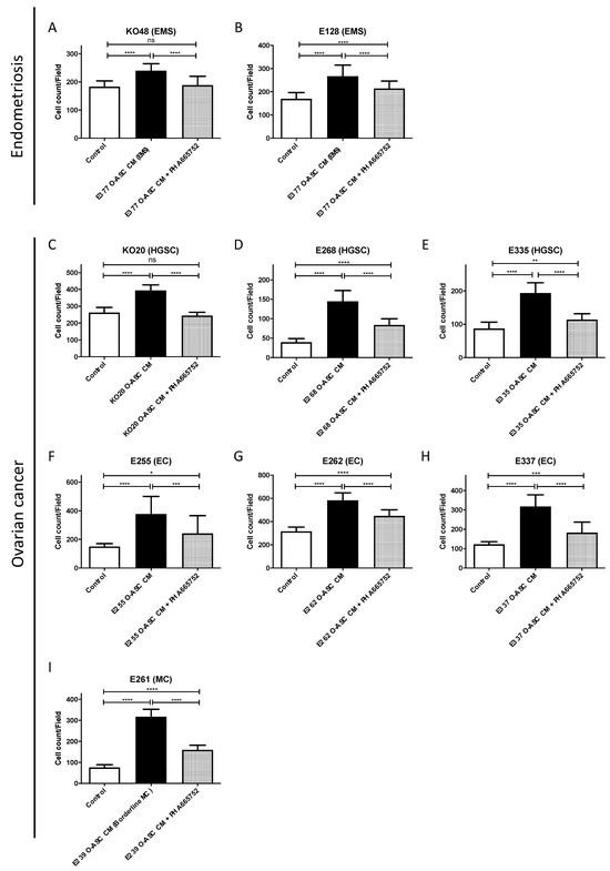 c-MET inhibition abrogated omental-adipose stromal cell conditioned media (O-ASC CM)-induced cell migration in endometriosis and ovarian cancer. For each assay, the chart title states the type of cells studied, the x-axis shows the type of medium used, the y-axis denotes the number of migrated cells. O-ASC CM used for each assay was derived from the same patient, except in the MC and EMS cases, where the O-ASC CM was derived from a BorMT patient (E239) and EMS patient (E377), respectively. Cell migration in ovarian cancer and endometriosis was enhanced in the presence of O-ASC CM but inhibited in the presence of c-MET inhibitor, PHA665752. This was observed across all histological types, including EMS (A,B), HGSC (C–E), EC (F–H) and MC (I). ANOVA followed by Tukey’s multiple comparison test was used for statistical comparison. Results are shown as mean + standard deviation (SD) (NS: Not significant; * p < 0.05; ** p < 0.01; *** p < 0.001; **** p < 0.0001). See also Table S2. For each experiment, five random fields were imaged per transwell and at least two replicates were included. Abbreviations: HGSC, high grade serous carcinoma; EC, endometrioid carcinoma; MC, mucinous carcinoma; BorMT, borderline mucinous tumor; EMS, endometriosis.