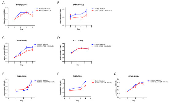The MTT assay was used to evaluate the effect of O-ASC CM on cell viability in primary cultures of endometriosis and ovarian cancer (Figure 6). As the MTT assay measures the number of metabolically active cells, it is used as a proxy for cell proliferation since a higher number of viable cells reflects an increase in cell growth. In our study, we evaluated cell viability over a 6-day period because the primary cells grew at a slower rate and usually reached near-confluence on the sixth day. The O-ASC CM used was from the same patient or from the same histological type. Relative to control, O-ASC CM did not induce a significant change in cell proliferation of HGSC (KO20, E164; Figure 6A,B) nor EMS (E128, E271; Figure 6C,D). Cell proliferation was also not affected in EMS (E128, E195, KO48; Figure 6E,G) when exposed to O-ASC CM from BorMT or HGSC.
