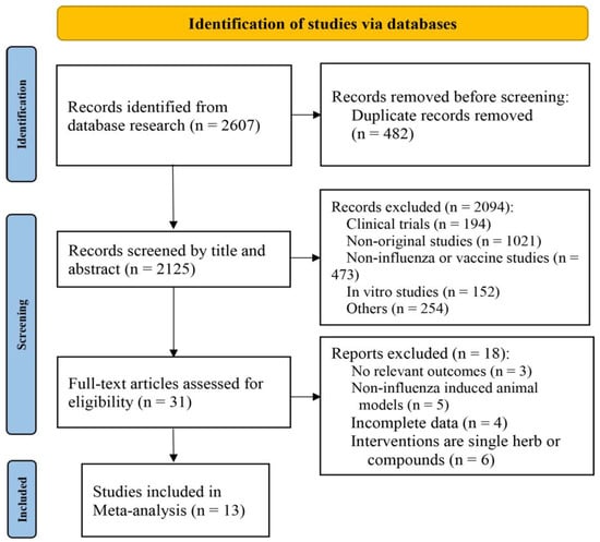 The systematic search collected a total of 2607 articles, including PubMed (387), Embase (1574), Web of Science (351), CNKI (46), CBM (130), Wanfang (99), and VIP (20). We adjusted for duplicates, and 2165 articles remained. Then, based on detailed reviews of their titles and abstracts, 2138 publications were excluded because of the following reasons: (1) clinical trials; (2) non-original studies; (3) non-influenza studies; (4) in vitro studies; (5) others. After a full-text review of 31 articles, 13 eligible studies were included in this systematic review and meta-analysis. The process of study selection is shown in Figure 1.