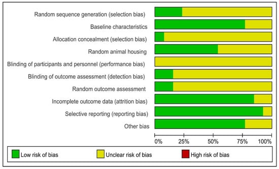 The quality of all eligible studies was assessed using SYRCLE’s Risk of Bias tool (Figure 3). Random sequence generation and allocation concealment showed moderate to high proportions of unclear risk, with 10 and 12 studies, respectively, categorized as unclear. This suggests that randomization processes and allocation concealment were not consistently reported, raising potential concerns about selection bias.