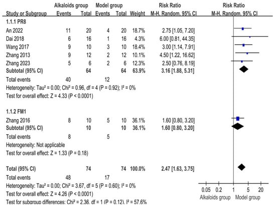 Effects of alkaloids on survival rate. The effects of alkaloids on survival rate compared to the model group were shown through a forest plot (effect size and 95% confidence interval). Black diamonds represented the pooled effect size. Blue squares represented the risk ratio, of each individual study, with the size of the square reflecting the weight of the study. The references cited in 1.1.1 PR8 were [27,28,30,32,33]; The reference cited in 1.1.2 FM1 was [38].