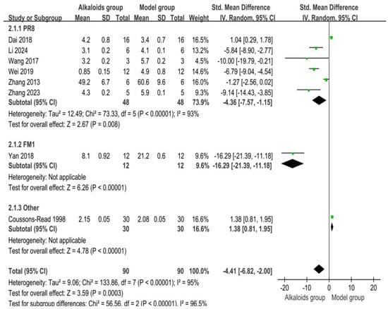 Effects of alkaloids on viral titers. The effects of alkaloids on virus titers compared to the model group were shown through a forest plot (effect size and 95% confidence interval). Black diamonds represented the pooled effect size. Green squares represent the SMD of each study, with their size indicating the study’s weight. The references cited in 2.1.1 PR8 were [28,29,30,32,33,34]; The reference cited in 2.1.2 FM1 was [26]; The reference cited in 2.1.3 Other was [35].