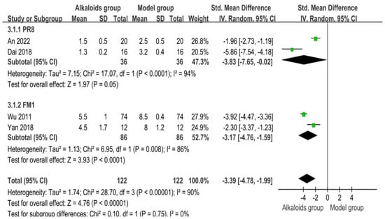 The effects of alkaloids on pulmonary inflammation scores are shown in Figure 6. Two studies were included in the PR8 subgroup. The combined SMD was −3.83 (95% CI: −7.65 to −0.02; p = 0.05), indicating a significant reduction in pulmonary inflammation scores in the experimental group compared to the control group. However, high heterogeneity was observed (I2 = 94%, p < 0.0001), suggesting variability among the included studies. Two studies were also included in the FM1 subgroup. The pooled SMD was −3.17 (95% CI: −4.76 to −1.59; p < 0.0001), showing a significant reduction in pulmonary inflammation scores for the experimental group. Moderate heterogeneity was detected (I2 = 86%, p = 0.008), suggesting some level of inconsistency among these studies. When combining all four studies, the overall SMD was −3.39 (95% CI: −4.78 to −1.99; p < 0.0001), indicating a significant reduction in pulmonary inflammation scores in the experimental groups across all included studies. High heterogeneity was observed (I2 = 90%, p < 0.0001). The test for subgroup differences (Chi2 = 0.10, df = 1, p = 0.75) revealed no significant differences between the PR8 and FM1 subgroups.