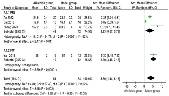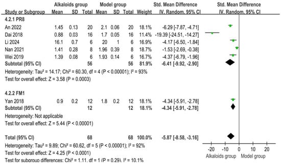 The effects of alkaloids on lung index are shown in Figure 7. Five studies contributed to the PR8 subgroup. The pooled standardized mean difference (SMD) was −6.41 [95% CI: −9.92, −2.90], indicating a significant reduction in lung index in the experimental group compared to the control group (Z = 3.58, p = 0.0003). High heterogeneity was observed (I2 = 93%, p < 0.00001). One study was included in the FM1 subgroup, with an SMD of −4.34 [95% CI: −5.91, −2.78], showing a significant reduction in lung index in the experimental group (Z = 5.44, p < 0.00001). No heterogeneity was reported. Across all included studies (n = 6), the pooled SMD was −5.87 [95% CI: −8.58, −3.16], indicating a significant overall reduction in lung index in the experimental group compared to the control group (Z = 4.25, p < 0.0001). Subgroup differences were not significant (Chi2 = 1.11, df = 1, p = 0.29; I2 = 10.1%).