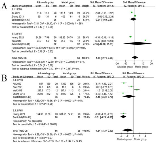 Effects of alkaloids on TNF-α and IL-6. The effects of alkaloids on TNF-α (A) and IL-6 (B) compared to the model group were shown through a forest plot (effect size and 95% confidence interval). Black diamonds represented the pooled effect size. Green squares represent the SMD of each study, with their size indicating the study’s weight. The references cited in 5.1.1 PR8 were [27,33]; The references cited in 5.1.2 FM1 were [26,37]; The references cited in 6.1.1 PR8 were [27,33,34,36]; The reference cited in 6.1.2 FM1 was [37].
