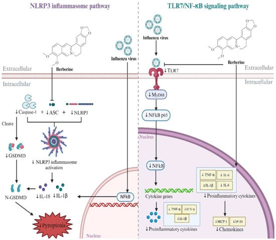 Multiple studies have confirmed that berberine (BBR) is antiviral, anti-inflammation, and anti-influenza and improves lung pathological change effects against the influenza virus both in vitro and in vivo [31]. The specific mechanism of BBR in treating influenza through the NLRP3 inflammasome pathway and TLR7/NF-κB signaling pathway is shown in Figure 10 and Table 2. Nuclear factor (NF)-κB has been identified as a key promoter for influenza-associated inflammation and effective viral replication [39]. In the NF-κB pathway, Toll-like receptor 7 (TLR7) can recognize viral single-stranded RNA and stimulate down-stream myeloid differentiation factor 88 (MyD88) to activate NF-κB thereby driving adhesion molecules and pro-inflammatory mediators [40,41]. Yan et al. confirmed that BBR strongly inhibits influenza virus replication in A549 cells and mouse lungs. BBR inhibited the up-regulation of TLR7, MyD88, and NF-κB (p65) at the mRNA and protein levels, thereby regulating the TLR7 signaling pathway [26]. Influenza virus infection triggers NLRP3 inflammasome activation to induce pro-inflammatory response and pyroptosis [42,43]. BBR has been shown to improve lung inflammation in influenza mice by inhibiting NACHT, LRR, and PYD domains-containing protein 3 (NLRP3) inflammasome activation and inhibiting GSDMD-mediated apoptosis by reducing GSDMD expression and suppressing NLRP3 inflammasome-mediated GSDMD activation. Specifically, BBR reduced the expression of NLRP3, apoptosis-associated speck-like protein containing a CARD (ASC), and cysteinyl aspartate-specific proteinase (Caspase) 1, and the ratio of Caspase1p20 subunit to Caspase1, thereby inhibiting the activation of NLRP3 inflammasome and leading to a decrease in the levels of mature IL-1β and IL-18 in the lungs [27].