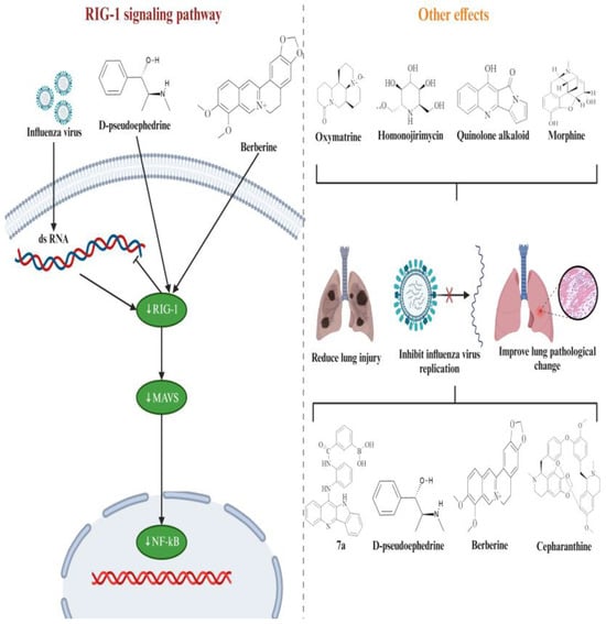 The other mechanisms of alkaloids in treating influenza are shown in Figure 11 and Table 2. Antiviral innate immune response receptor RIG-I (RIG-I) is a member of the RLR family and can induce innate immunity, inflammation, and gene expressions by detecting viral RNA ligands or processed self RNA in the cytoplasm, thereby limiting infection [44]. It works as the primary receptor to recognize intracellular ssRNA and transcriptional intermediates of influenza virus in infected host cells [45]. The innate immune response of the influenza virus is strictly dependent on RIG-I. Influenza virus infection can produce multiple RIG-I agonists, with the most critical RIG-I stimulant being the virus genome itself [46]. RIG-I exists both in the cytoplasm and nucleus, and the RIG-I signal plays a crucial role in restricting influenza virus replication [47]. For example, Kandasamy et al. showed delayed clearance of influenza virus after infection with influenza A virus in RIG-I deficient mice [48]. Together, during influenza virus infection, the virus-conserved components of pathogen-associated molecular patterns are recognized by host–pathogen recognition receptors, such as RIG-I, leading to the activation of innate immune signals and finally inducing the production of various cytokines and antiviral molecules, inhibiting influenza virus replication [49,50]. Mechanistically, RIG-I signaling mainly reduces influenza virus infection by generating interferon (IFN) [51]. Type I interferons, namely IFN-alpha and beta IFN-α and IFN-β, can prevent virus replication in the host [52]. L-Methylephedrine, L-ephedrine, and D-pseudoephedrine induced a significant increase in IFN-β levels [34]. In addition, in vitro experiments have shown that homoharingtonin can inhibit STING-mediated activation of the IFN-β promoter in a dose-dependent manner [53]. However, the effects of most alkaloids on IFN-α and IFN-β are still unclear, and further research can be conducted in the future. D-pseudoephedrine and BBR could significantly inhibit the mRNA expression of RIG-I, alleviate lung inflammation, improve immune function, and have a protective effect on infected mice [34]. Cepharanthine could reduce viral titers and alleviate pathological damage and inflammation in mouse lung tissue caused by the influenza virus [29]. Dai et al. confirmed that oxymatrine could improve the survival rate of influenza-infected mice, reduce lung index, alleviate lung inflammation, reduce lung virus titers, and improve pathological changes in lung tissue [30]. Homonojirimycin had a protective effect against influenza virus infection, significantly increasing the levels of IFN-γ and IL-10 and reducing the levels of TNF-α and IL-6 [33]. Morphine alleviated lung inflammation in influenza rats but hindered virus clearance from the lungs [35]. Two other derivatives of alkaloids (marine-derived quinolone alkaloid and quindoline derivatives) have been found to have anti-influenza activity and alleviate lung injury [28,32].