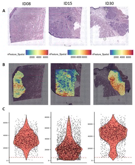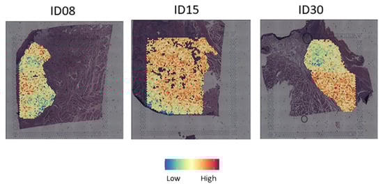 Mean DV200 for the RNA of the three samples included in the analysis was 46.9 (DV200 for ID08, ID15 and ID30 was 53.9, 41.7 and 45.0, respectively). The arbitrary stringent cut-off of 500 expressed genes per spot and 500 UMIs per spot showed that 96.1% of spots from the selected region of interest could be included in the analyses (Figure 1). Unfortunately, in the case of this study, quality control (tumor evaluation on HE staining or DV200) on available FFPE surgical sections from the patients included in the CHIRON study conducted by Schmitz et al. [] did not allow the realization of spatial transcriptomic analysis.