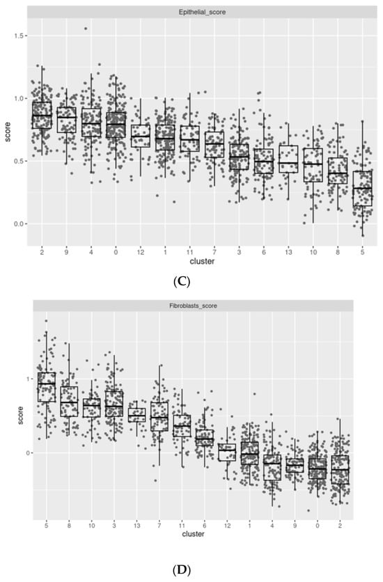 Based on the dimension reduction and clustering, we decided to merge clusters in the “tumor nodule (TN) 1” area (top left tumor nodule with clusters 2, 4 and 12); “TN2” (middle tumor nodule with cluster 1 only); “TN3” (bottom right tumor nodule with cluster 9 and 0). Similarly, the TME, or regions surrounding the “tumor nodules” were classified as followed: TME1 (clusters 8, 11, and 13, around TN1) and TME3 (clusters 3 and 7, around TN3). Using the epithelial and fibroblast gene lists of Puram et al. [], we were able to confirm that the clusters with a high epithelial score were in the subgroups TN 1, 2, and 3 (Figure 2C) and the clusters with a high fibroblast score were in the subgroups TME 1 and 3 (Figure 2D). Cluster 5, 6, and 10 were not included in a subgroup because they were not limited to a single tumor nodule.