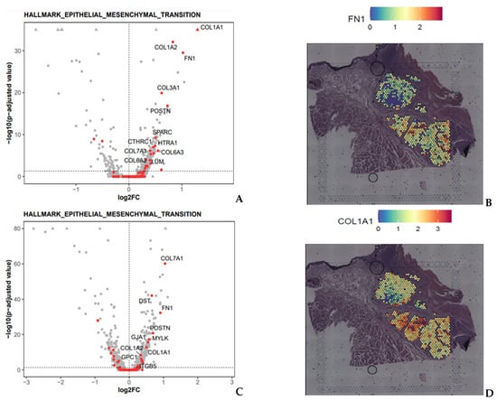 Similarly, TME3 vs. TME1 differential expression analyses showed 900 differentially expressed genes, including 858 upregulated genes (e.g., MMP11, POSTN, FN1, COL1A1, CXCL9, CXCL14) and 42 downregulated genes (e.g., KRT13, S100A8, S100A9) in TME3 compared to TME1 (Figure 6A–D and Supplementary Table S3). ORA of upregulated genes showed significant activation of the hallmark epithelial–mesenchymal transition (p < 0.05). On the other hand, ORA of the downregulated genes showed significant activation of the hallmark epithelial–mesenchymal transition (p < 0.001), hallmark hypoxia (p < 0.05), hallmark coagulation (p < 0.05), hallmark apoptosis (p < 0.05) and hallmark estrogen response late (p < 0.05) gene lists.