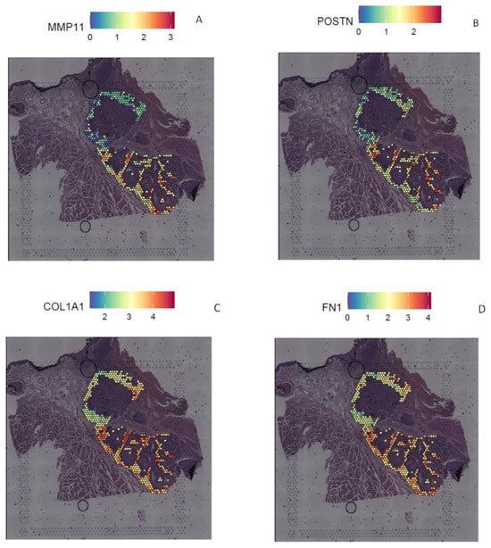 Differential expression analysis of the tumor microenvironment. Representation of the expression of MMP11 (A), POSTN (B), COL1A1 (C) and FN1 (D), upregulated genes in the TME3 vs. TME1 differential expression analysis.