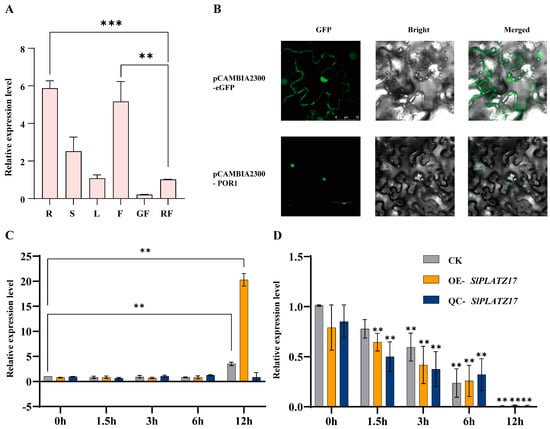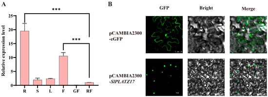 Expression pattern analysis of SlPLATZ17 in tomato and its subcellular localization. (A) Expression of SlPLATZ17 in R, roots; S, stems; L, leaves; F, flowers; GF, fruit at mature green stage; RF, fruit at mature red stage in WT (***; p ≤ 0.001). (B) Subcellular localization of SlPLATZ17 protein in tobacco leaves. Bars: 25 µm; 60 µm.