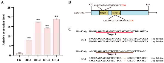 Identification of SlPLATZ17-overexpressing and SlPLATZ17 knockout plants. (A) SlPLATZ17 gene expression in CK and SlPLATZ17-overexpressing plants. Data are presented as means ± SEs (n = 3). ** (p ≤ 0.01) indicates significant differences compared with CK (AC), as determined by one-way ANOVA. (B) Schematic diagram of tomato genome editing mediated by CRISPR/Cas9. Arrow indicates direction of genome, from 5′ to 3′. Yellow boxes represent sgRNA target sites, sequences of which are also shown. PAM motifs are marked in red. (C) Sequence near mutation site of SlPLATZ17 gene. Lower part of sgRNA target site is marked with red line.