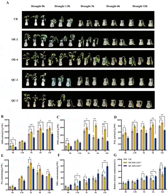 Overexpression of SlPLATZ17 improved drought tolerance in tomato. (A) Changes in phenotypes of different plant lines under drought stress. Analysis of physiological indicators of different plant lines under drought stress: (B) SOD activity; (C) POD activity; (D) PAL activity; (E) Pro content; (F) MDA content; (G) relative electrical conductivity. All treatments were performed in triplicate with biological replicates. * (p ≤ 0.05) and ** (p ≤ 0.01) indicate significant differences compared with CK at each time point, as analyzed by one-way ANOVA.