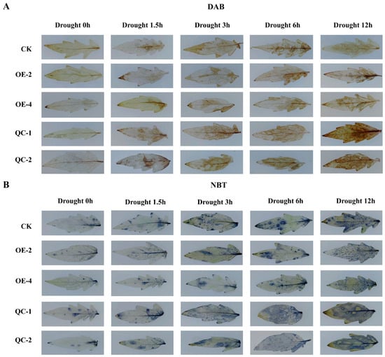 Reactive oxygen species staining in different plant lines under drought stress. (A) DAB staining of different lines under drought treatment, with brown representing H2O2. (B) NBT staining of different lines under drought treatment, with blue representing O2−.