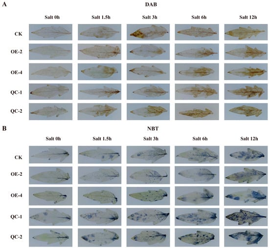 Reactive oxygen species staining in different plant lines under salt stress. (A) DAB staining of different lines under salt treatment, with brown representing H2O2. (B) NBT staining of different lines under salt treatment, with blue representing O2−.