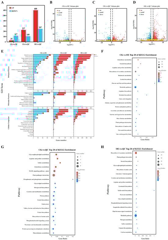 We compared AC plants, OE plants, and gene-edited plants in a pairwise manner on the basis of their gene expression levels in the 0 h transcriptome; compared with OE plants, CK plants presented a lower number of upregulated genes; compared with QC plants, CK plants presented a greater number of upregulated genes (227); and compared with QC plants, OE plants presented 600 upregulated genes and 247 downregulated genes (Figure 7A). On the basis of the significantly differentially expressed genes in the comparison group, we performed volcano plot analysis (Figure 7B). The distribution of upregulated and downregulated is visualized in the figure for a more intuitive depiction. The volcano plot for the OE plants compared with the QC revealed the presence of significantly more upregulated genes and a wider distribution at both ends, indicating a greater degree of genetic differentiation. GO analysis of the three groups of materials, CK, OE, and QC, revealed that the three groups of materials presented the most variation in the number of differentially expressed genes in the biological process category, and in the comparison of two groups of materials, OE and QC, the number of upregulated genes related to biological processes was also the greatest, including genes involved in metabolic processes and cellular processes. The cellular component terms with the greatest number of upregulated genes were the cellular, cellular components, etc.; the molecular function terms with the highest number of upregulated genes were functions such as catalytic activity and nucleic acid binding transcription factor activity (Figure 7C–E). KEGG analysis of the differentially expressed genes was performed on the three groups of materials, and pairwise comparison revealed that the most enriched metabolic pathways in the CK vs. OE group included glutathione metabolism, steroid biosynthesis, arginine and proline metabolism, and secondary metabolism biosynthesis; the differentially abundant metabolites in the CK vs. QC group were enriched mainly in glycerophospholipid metabolism, arginine and proline metabolism, sulphur metabolism, and glutathione metabolism; the pathways with the most significant differences in the OE vs. QC group were secondary metabolism biosynthesis, plant–pathogen interactions, and steroid biosynthesis (Figure 7F).