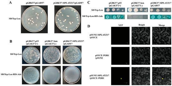 To screen for proteins that interact with SlPLATZ17, we performed a yeast two-hybrid library screen. First, the toxicity and self-activation of the pGBKT7-SlPLATZ17 bait gene were examined, and it was found that all the transformants grew on SD medium lacking Leu and Trp (SD/Trp-Leu), whereas their growth on SD medium lacking Leu, Trp, His and Ade (SD/Trp-Leu-His-Ade) was effectively inhibited, indicating that SlPLATZ17 did not have toxic effects and that self-activation did not occur (Figure 8A,B). After screening and analysis, we ultimately selected seven proteins that may have relevant functions for interaction validation (Table S4). Among these, only pGBKT7-SlPLATZ17 and pGADT7-POR1 showed normal growth in SD/Trp-Leu and SD/Trp-Leu-His-Ade + X-α-gal medium, and the clones presented blue colouration (Figure 8C), whereas the clones with the remaining six proteins presented no blue colouration on the quadruple dropout medium. These findings indicated that SlPLATZ17 interacted with the POR1 protein but not with the remaining six proteins. These interactions were further verified via a bimolecular fluorescence complementation (BiFC) assay, which revealed that SlPLATZ17 interacted with POR1 proteins in the nucleus (Figure 8D).