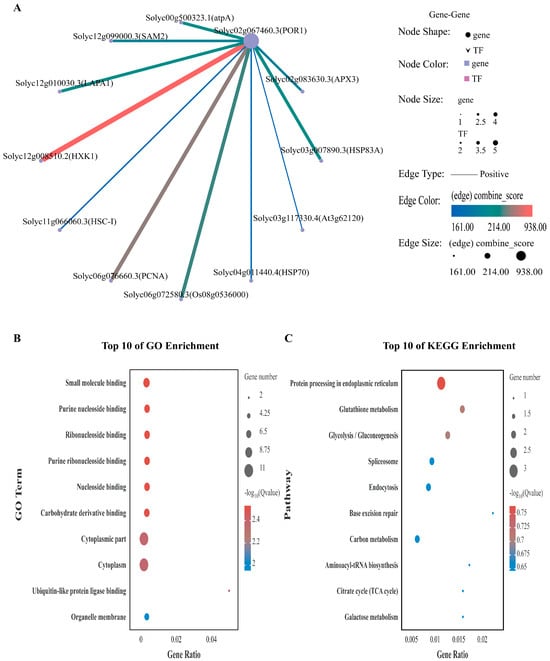 To further explore the regulatory pathways in which POR1 may be involved, we established a network of interacting genes in the transcriptome database for the protein POR1, as shown in Figure 10A. The set of POR1 protein-interacting genes was subjected to GO and KEGG analyses (Figure 10B,C). The genes that interact with the POR1 protein were enriched mainly in cellular processes, individual tissue processes, metabolic processes, and stimulus responses in the GO analysis, and meticulous delineation revealed them to be involved in small molecule binding, purine-ribonucleoside binding, ribonucleoside binding, purine-ribonucleoside binding, nucleoside binding, carbohydrate derivative binding, cytoplasmic fractions, and the cytoplasm. The genes interacting with POR1 proteins identified via KEGG analyses were enriched in protein processing in the endoplasmic reticulum, glutathione metabolism, glycolysis/gluconeogenesis, and carbon metabolism.