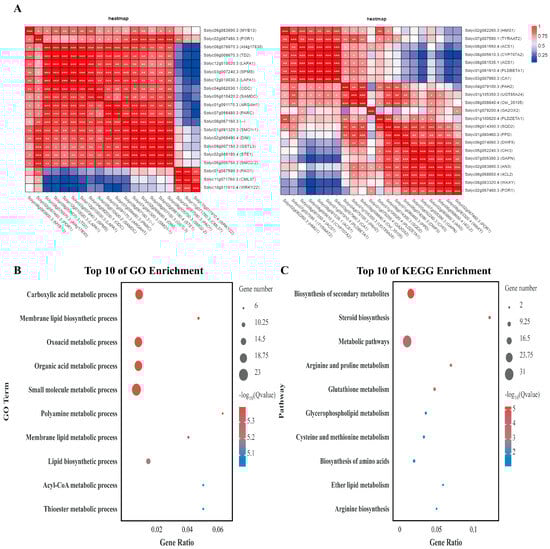 We analyzed the correlations of the coexpression of the reciprocal protein POR1 and found that most of the genes were highly correlated with POR1 (Figure 11A). These genes were subsequently analyzed via GO, and most of the genes were enriched in the processes of carboxylic acid metabolism, membrane lipid biosynthesis, oxyacid metabolism, organic acid metabolism, small molecule metabolism, polyamine metabolism, membrane lipid metabolism, and lipid biosynthesis (Figure 11B). KEGG analysis revealed that most of the differentially expressed genes were associated with the biosynthesis of secondary metabolites, steroid biosynthesis, metabolic pathways, arginine and proline metabolism, glutathione metabolism, and other metabolic processes (Figure 11C).