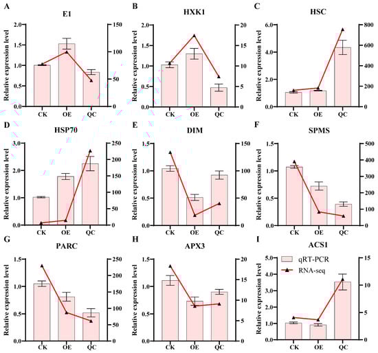 qRT-PCR validation of RNA-Seq results. (A,B) Relative expression of genes related to glycolysis. (C,D) Relative expression of genes related to protein processing in endoplasmic reticulum. (E) Relative expression of genes related to steroid biosynthesis. (F) Relative expression of genes related to arginine and proline metabolism. (G,H) Relative expression of genes related to glutathione metabolism. (I) Relative expression of genes related to secondary metabolism. Vertical coordinate on left represents qRT-PCR results for differentially expressed genes, while vertical coordinate on right represents RNA-seq results. Data are presented as means (±SEs) of three independent biological replicates.