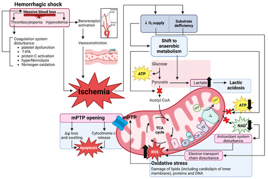 Pathogenesis of hemorrhagic shock. The massive blood loss leads to hypovolemia and thrombocytopenia, resulting in peripheral vasoconstriction and coagulopathy, respectively. The reduction in circulatory volume combined with vasoconstriction leads to tissue ischemia and a subsequent metabolic switch to anaerobic bioenergetics, which manifests itself in lactic acidosis, a decrease in the amount of ATP in the cells, and a disturbed redox balance. These changes result in a dysfunction of mitochondria, the cellular antioxidant defense system, oxidative stress, mPTP opening, and finally, cell death. α-AR—α-adrenoreceptors, ADP—adenosine diphosphate, ATP—adenosine triphosphate, Cyt C—cytochrome c, NAD+—nicotinamide adenine dinucleotide, mPTP—mitochondrial permeability transition pore, ROS—reactive oxygen species, and tPA—tissue-type plasminogen activator.