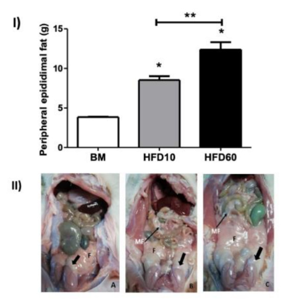 Distribution and weight of fat deposits in Wistar rats under varying dietary conditions. (I) Quantitative analysis of epididymal fat weight: balanced meal, high-fat diet (10%), and high-fat diet (60%) (n = 6). (II) Morphological assessment of fat distribution, highlighting total fat (F), mesenteric fat (MF; indicated by the slim black arrow), and peripheral epididymal fat (indicated by the gross black arrow) in Wistar rats across three dietary conditions: balanced meal (A), high-fat diet 10% (B), and high-fat diet 60% (C). * Represents significant differences between the experimental group and the control group. ** Represents p < 0.05.