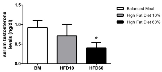 Serum testosterone levels in Wistar rats Under different dietary regimens: balanced meal, high-fat diet (10%), and high-fat diet (60%). Values (n = 6) are expressed as mean ± standard deviation (SD). Statistical analysis indicates a significant difference between the balanced meal and the high-fat diet 60% groups (p < 0.05). * Represents significant differences between the experimental group and the control group.