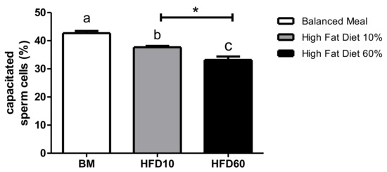 Capacitated sperm cells, as determined by the chlortetracycline (CTC) assay, after a 6-h incubation period in a capacitation medium. Data (n = 6) are expressed as average ± standard deviation (SD). Different letters (a, b, c) indicate significant differences. Specifically, a significant difference was observed between the high-fat diet 10% (HFD10) and high-fat diet 60% (HFD60) groups (p < 0.05). * Represents significant differences between the experimental group and the control group.