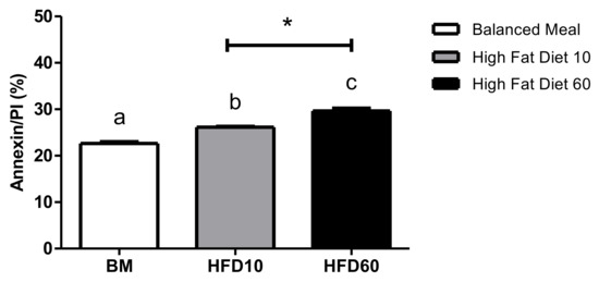 Phosphatidylserine externalization in sperm cells from high-fat diet Wistar rats, presented as average ± SD. Different letters (a, b, c) indicate significant differences. Specifically, a statistically significant difference was observed between the high-fat diet 10% (HFD10) and high-fat diet 60% (HFD60) groups (p < 0.05) (n = 6). * Represents significant differences between the experimental group and the control group.