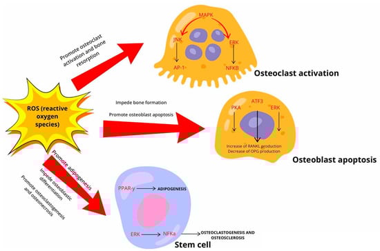 Osteoclasts are cells derived from bone marrow macrophages, and play a pivotal role in regulating bone resorption during bone homeostasis. A comprehensive understanding of the factors that regulate osteoclast differentiation and activity is crucial for the study of diseases characterized by an imbalance in bone remodeling, with increased resorption relative to formation. Over the past decade, research has demonstrated that reactive oxygen species (ROS), including superoxide and hydrogen peroxide, play a pivotal role in regulating the differentiation of osteoclasts []. There is evidence to suggest that these may play a significant role in the pathogenesis of fatty degenerative osteonecrosis of the jaw. As naturally occurring by-products of cellular metabolism, ROS are involved in normal cellular signaling and processes such as adipocyte differentiation. During the process of adipogenesis, ROS are produced as a consequence of differentiation and as a result of other metabolic processes [,]. Nevertheless, the precise sources and mechanisms responsible for ROS production during adipogenic differentiation in mesenchymal stromal/stem cells (MSCs) in vivo remain elusive. Furthermore, it is unclear whether the ROS observed during adipocyte differentiation are a cause or consequence of the process []. Notably, antioxidants or ROS scavengers have been shown to suppress ROS effects on adipogenesis, indicating that oxidative stress might influence this differentiation pathway [,]. It is established that the primary function of the peroxisome proliferator-activated receptor (PPAR-γ) is to regulate adipocyte differentiation []. ROS have been demonstrated to enhance the formation of PPAR-γ via the redox-sensitive nuclear factor (NRF2) pathway []. Moreover, evidence indicates that PPAR-γ is capable of inducing an increase in ROS production as well [,]. In FDOJ, this oxidative stress has the potential to disrupt bone homeostasis by damaging essential cellular components, including lipids, proteins, and DNA, which could impair bone repair and regeneration. Additionally, elevated ROS levels may stimulate the release of inflammatory cytokines, such as IL-1 and IL-6, contributing to prolonged inflammation and osteonecrosis []. The findings of a study by Kanda et al. [] suggest that an increase in the intracellular ROS level via NAD(P)H oxidase (Nox4) mediates adipocyte differentiation through cAMP response element-binding protein (CREB) in MSCs. Dong et al. observed that free fatty acids (FFAs) released by adipocytes inhibit osteoblast proliferation and function and induce osteoblast apoptosis. Additionally, the same study demonstrated that FFA-generated ROS are a key factor in the adipocyte-induced activation of extracellular signal-regulated kinase (ERK)/P38 signaling, which leads to activation of osteoblast apoptosis []. The MAPK family, comprising ERKs, JNKs, and p38, is understood to be activated by MARK kinases, and plays a role in the translocation of c-Fos and NFATc1, which in turn drives osteoclast lineage. It has been demonstrated that ROS inhibit MARK phosphatases, which consequently enhances MARK expression []. Additionally, ROS have been observed to activate the β-catenin/FoxOs and ERK/NFκB signaling pathways, while simultaneously inhibiting the p38 signaling pathway, which ultimately results in a reduction in osteoblastogenesis []. Figure 2 illustrates the principal signaling pathways that are disrupted by ROS in osteoblasts, osteoclasts, and MSCs.