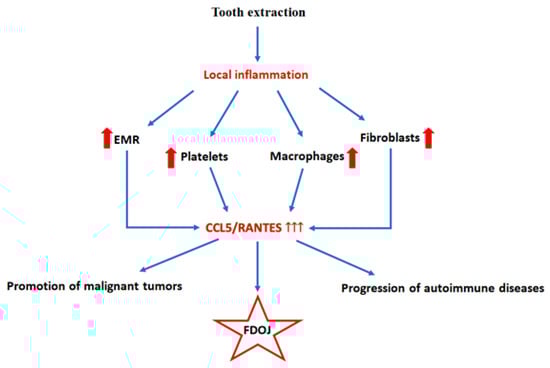 CCL5/RANTES is a 68-amino-acid protein belonging to the CC chemokine family, which functions as a signaling molecule in the immune system. CCL5/RANTES plays a significant role in inflammatory processes and immune responses, particularly in attracting specific types of immune cells to sites of inflammation []. CCL5/RANTES is released in significant quantities by a number of cell types in response to infectious or inflammatory stimuli, including platelets, macrophages, fibroblasts, and eosinophils, as well as epithelial cells, vascular endothelial cells, and endometrial cells []. This recruitment of immune cells to damaged or infected tissues is a key aspect of the body’s immune response. The primary physiological functions of CCL5/RANTES encompass the chemotaxis of T lymphocytes, eosinophils, and basophils to sites of inflammation. Furthermore, it plays a role in the recruitment of natural killer (NK) cells and dendritic cells. Furthermore, it facilitates the maintenance of inflammatory states by stimulating the secretion of inflammatory mediators, such as cytokines []. Elevated levels of CCL5/RANTES have been demonstrated to contribute to the pathogenesis and progression of autoimmune disorders, including bronchial asthma, rheumatoid arthritis, systemic lupus erythematosus, and Addison’s disease [,,].Although the inflammatory response of the body represents one of the body’s defense mechanisms against cancerous growths, a chronically sustained inflammatory state can paradoxically promote their development. Elevated levels of CCL5/RANTES have been observed in specific malignant neoplasms, including breast cancer, malignant melanoma, and prostate cancer [,,]. In the context of FDOJ, CCL5/RANTES is a principal inflammatory mediator associated with this condition (Figure 3). A substantial body of clinical evidence demonstrates that RANTES levels in regions affected by FDOJ are markedly elevated, frequently exceeding typical values by several-fold [,,,,,,,,,,,,,,,,,,].The physiological inflammatory response as a consequence of localized bone tissue injury, such as that resulting from periapical tissue inflammation, bone damage caused by a dental implant, or the state following tooth extraction, can transition into a chronic process. This is accompanied by elevated local levels of RANTES. This prolonged inflammatory process leads to the development of disorders characterized by fatty degeneration of the bone marrow []. It is noteworthy that FDOJ frequently coexists with various systemic diseases, including those affecting the nervous system (such as migraines, trigeminal neuralgia, and neurodegenerative diseases), rheumatoid disorders, and cancers (such as breast and prostate cancer). These conditions share a common denominator: elevated levels of CCL5/RANTES [,,,,,].